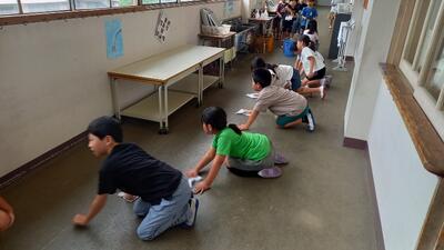 一列に並んで、声をかけながら掃除をしています。