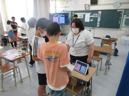 昨日1年生の教室を覗いてみると、机の上にタブレットがありました。いよいよ1年生のタブレットデビューです。ICT支援員の木村さんにお世話になりながら写真を撮ってロイロノートで提出するという学習をしていました。ひとつひとつ確認しながら行い、できたら「やったー!」という歓声もあがっていました。みんなが提出した写真が大型テレビに映し出されると「お~!」という感動の声も聞こえました。これからどんどん活用して学習に生かしていきましょう!