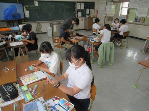 5年生は家庭科。ついこの前ボタン付けの練習をしていましたが、もう小物づくりに挑戦していました。小物入れやポケットティッシュケースを作っていました。出来上がった作品は早速使用していました。