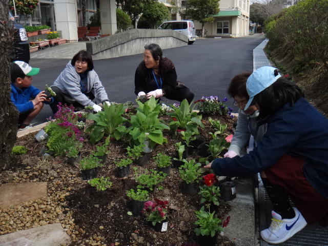 花壇の植え替えを行いました。ボランティアの方と環境委員会の子どもたちと楽しく活動できました。正門前が明るくなりました。ぜひ、見に来られてください。