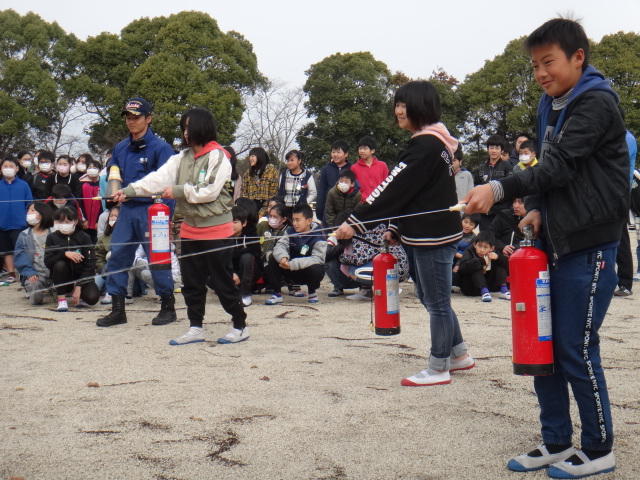 本日、火災避難訓練を行いました。消防署の方に、上手に避難することができたと褒めていただきました。生活安全委員会の6年生3人が水消化器で消火訓練を行いました。