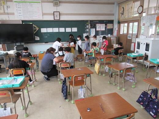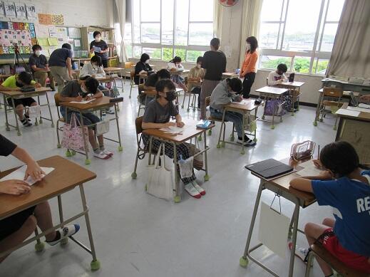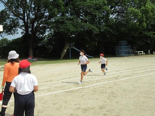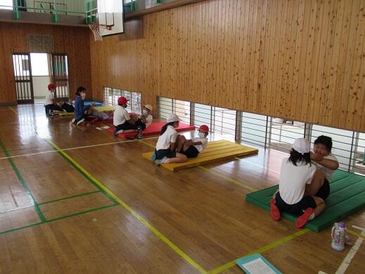 昨日(7日)体力テストを行いました。50m走、ソフトボール投げ、上体起こし、反復横跳び、立ち幅跳びの5種目を行いました(シャトルラン・握力・長座体前屈は各学級で)。1年生と6年生、2年生と5年生、3年生と4年生でペアになり、各種目を回って測定していきました。また、4名の保護者の方にボランティアとして測定のお手伝いをしていただき、スムーズに測定することができました。先週の委員会の時に、体育委員会が各学年、各種目の平均値を表示してくれていましたので、それを超えようとがんばる姿が見られました。天候に恵まれ暑い中での測定でしたが、みんなよくがんばりました!