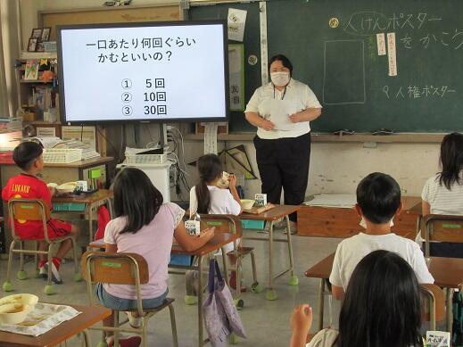 先週の金曜日、給食の時間に、3年生教室に本校出身の先輩がお見えになりました。現在尚絅大学3年生で、給食センターに実習に来られている今村先生です。この日は、3年生に「かむことの大切さ」について短い時間ですが、講話をしていただきました。食べながらではありますが、3年生の子どもたちは一生懸命今村先生のお話に耳を傾けていました。もしかしたら、将来こんな風に母校にお話に来てくれる子どもたちが育つかもしれませんね。