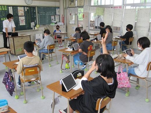 【一生懸命授業に参加する3年生】          【ロイロノートを活用して考えを共有】