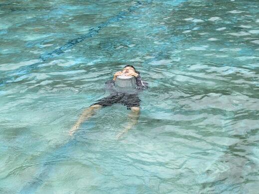 【髙尾先生の水に浮く見本、さすがです!】     【先生の真似をしてチャレンジ!】