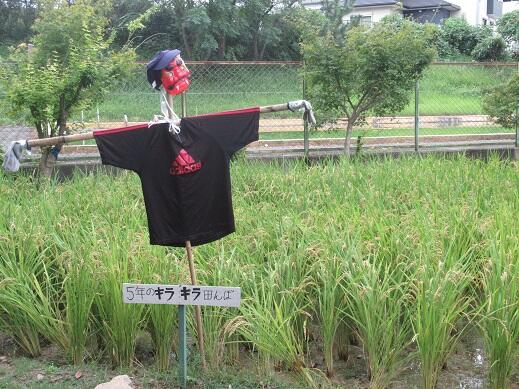6月に5年生が田植えをした田んぼのイネが大きく生長し、いよいよお米の穂が頭を垂れてきました。稲刈りが近づいてきているようです。5年生が案山子を作って穂を守ってくれています。今朝、交通指導を終えて田んぼの様子を見に行くと、草取りをしている子どももいました。みんなで大切に見守ってきた(担任の古島先生が一番大切にされていたようです)田んぼからどれくらいのお米がとれるか楽しみです!百人一首の中に「秋の田のかりほの庵(いほ)の苫(とま)をあらみ わが衣手は露にぬれつつ」と詠んだ天智天皇の作品がありますが、昔から日本人と田んぼの関係は切っても切れないものだったのですね。
