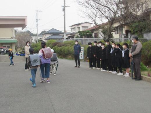 金曜日、朝からあいにくの天気でしたが、四中あいさつ運動がありました。コロナ禍でなかなか実施できませんでしたが、久しぶりの実施でした。朝から四中の1年生が正門のところに整列して、登校してくる小学生に元気にあいさつをしてくれました。初めて経験する小学生もたくさんいて、なにごとかとびっくりする様子も見られましたが、中学生が堂々とあいさつする姿を見て学ぶものがあったと思います。卒業生がこうやって小学校であいさつをしてくれるなんて素敵ですね。新年度になっても定期的に実施できればうれしいです。中学生のみなさんありがとうございました!