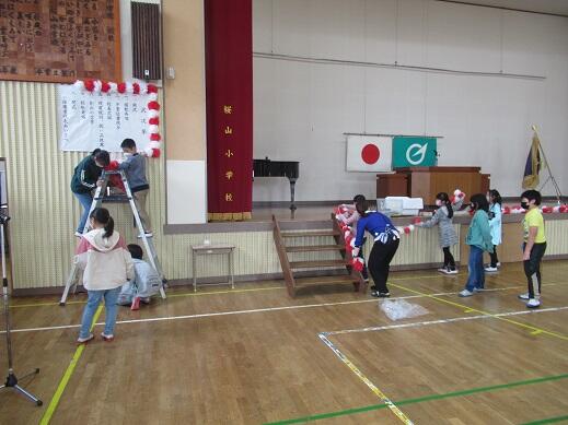 給食を食べた後、4年生と5年生が残って卒業式の準備をしてくれました。体育館は主に4年生が担当してくれていましたが、進んで働き、一生懸命6年生のために準備をしてくれました。来年度はリーダー学年になるという自覚が感じられ、うれしく思いました。いよいよ明日で6年生とはお別れになりますが、思い出に残る卒業式にしようと職員一同張り切っています。