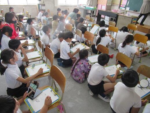 3年生と4年生は合同で図工でした。先生の指示に従い、自分の顔を描いていました。中には本物そっくりの顔もできていました。