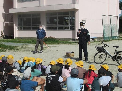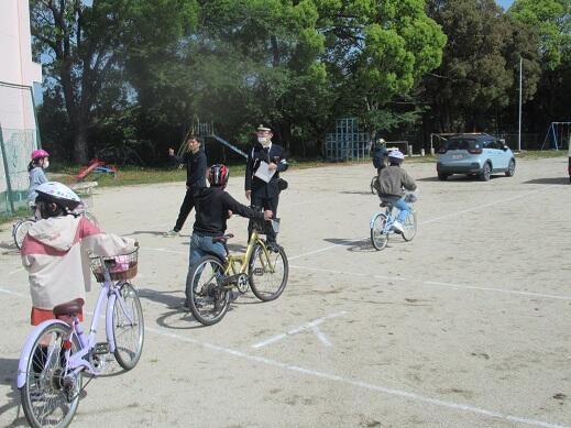 昨日の2時間目に1・5・6年生、3時間目に2・3・4年生の交通教室を行いました。荒尾市防災安全課より2名の方にお越しいただき、さらに見守り隊の方々のご協力もいただきました。1・2年生は横断歩道の渡り方、3年生以上は安全な自転車の乗り方を学びました。横断歩道では「手を挙げて、右・左・右、安全渡れ」が合い言葉、自転車に乗る前の点検の時は「ブタはしゃべる」が合い言葉です(ぜひ子どもたちに意味を尋ねてください)。最近自転車のマナーがよくないというお話が学校にも届いています。自分の命を守るため、学習したことを生かしていきましょう!