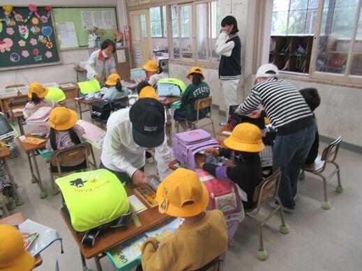 先週入学してきた1年生が、日々成長しています。登校初日は右も左もわからなかった1年生ですが、担任の池田先生、支援員の高田先生、そしてお手伝いをしてくれる6年生のおかげで少しずつ学校に慣れてきています。