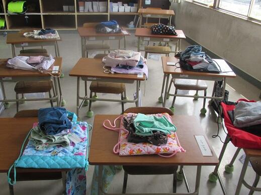 体育服に着替えた後です。机の上にはきちんと畳んだ洋服がありました。えらい!