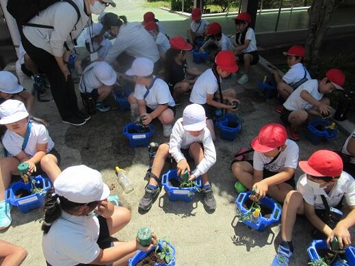 昨日、2年生がミニトマトの苗を植えました。1年生の時にあさがおやチューリップを育てた自分の鉢にミニトマトを植えました。担任の間正先生に土を入れてもらって(途中から私と用務員の藤本先生も加勢して)一人一人大事に苗を植え、たっぷり水をあげました。暑い中でしたので、ふにゃっとしていた苗でしたが、今朝見てみると元気になっていました。これからお世話をがんばってたくさんのミニトマトができるといいですね!