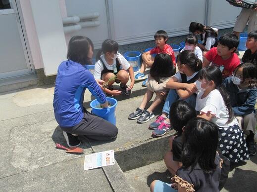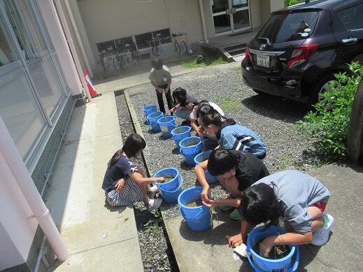 先月、5年生のバケツ稲作りについてお伝えしましたが、先週動きがありましたので続報です。バケツに植えていた稲が生長してきましたので、一旦抜いて、5本程度をまとめて真ん中に植え替える作業を行いました。いわゆる田植えの作業です。担任に松浦先生の説明を聞いた後早速作業に取り掛かりましたが、成長しすぎていたのか「根っこが切れました~!」という悲鳴があちこちから聞こえながらの作業でした。しかし、何とか田植え完了!昨年田んぼとして利用していたところの土を使っていたせいでしょうか、「先生、エビがいます!」というハプニングもありました(エビらしき生物は、子どもが持って帰ったようです)。今後、水をひたひたにして成長を見守ります。