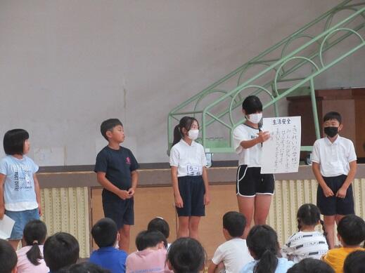 昨日の昼活動は児童集会で、生活安全委員会の発表でした。生活安全委員会の子どもたちが、委員会発表のトップバッターを務めてくれました。前回の代表委員会で、「生活を振り返ろう」という議題について話しあったとき、自分たちの生活で課題があることについて生活安全委員会がいろいろな取組をしてくれることになりました。その中で、現在「あいさつ名人調べ」をしてくれています。あいさつ名人がたくさんになるといいですね。これからも、他のことにも挑戦してくれるそうで、期待が持てます。6月の梅雨の時期、落ち着いた学校生活を送るために生活安全委員のみなさん、よろしくお願いします!