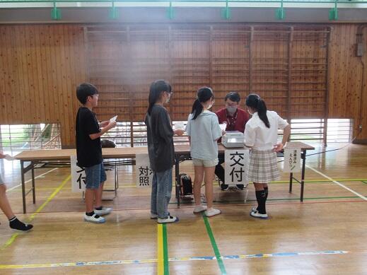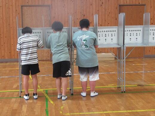 水曜日の5時間目に6年生で選挙出前授業がありました。荒尾市の選挙管理委員会事務局よりおいでいただき、選挙の歴史や選挙の仕方等についてお話していただきました。その後、桜山市長選を想定し、私(校長)、養護教諭の川﨑先生、担任の髙尾先生が候補者として公約を述べ、子どもたちが模擬選挙を行いました。実際の投票箱等を準備いただき、受付から投票、そして開票まで行いました。その結果、担任の髙尾先生が当選!見事桜山市長に選ばれました。私は2年連続の落選となり、ちょっぴり傷ついた模擬選挙でした。子どもたちは、「選挙は難しいと思っていたけど、3分で終わる簡単なものと初めて知りました」「18歳になったら選挙に行こうと思いました」など選挙に前向きな感想を持っていました。選挙管理委員会のみなさん、お世話になりました!