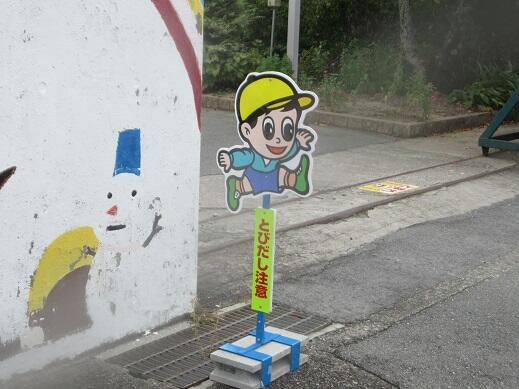 学校の正門の前に、新しいお友だちです。みんなの命を守る「とびだし注意ぼうや(本名はわかりませんが…)」を設置しました。門の手前に「とまれ」のシールを貼り子どもたちに注意喚起をしているところですが、ドライバーの方へも呼びかけようと事務の本村先生に買っていただき、用務員の藤本先生に設置していただきました。子どもたちの安全のため、がんばってくれるものと期待しています!