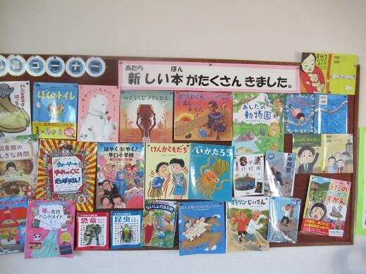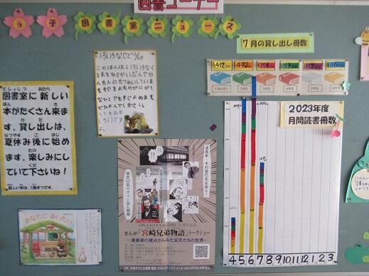本校の図書室は、みなさんに自慢できるほど環境が整えられています。数年前に、多くの方のお力をお借りしてリニューアルされたと聞いています。子どもたちも図書室が大好きで、毎朝子どもたちで大賑わいです。昨日の朝も、たくさんの子どもたちが本を借りに来ていました。今年も、子ども未来文庫や荒尾市より200冊以上の新書を購入し、夏休み中に司書の中島先生が貸し出しできるように整備してくださいました。今年の貸し出し目標冊数は15000冊です。毎月の貸し出し冊数を掲示してありますが、グラフが画用紙からはみ出る月もあるほどたくさんの本を借りている子ども達です。たくさん本を読んで心に栄養を蓄えましょう!