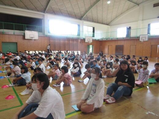 昼食後に平和学習を行いました。最初に平和集会をし、講和のあと資料館の見学を行いました。戦争の悲惨さや平和の尊さを感じてくれたことと思います。しかし、見学中に突然の雨となり、雷雨の中を枕崎市立桜山小学校へ向かいました。