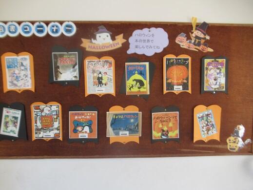 北校舎2階の図書コーナーです。ハロウィンを意識した掲示です。