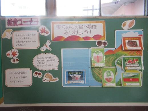 北校舎1階の食育コーナーです。秋と言えば「食欲の秋」ですね。旬の食べ物が紹介されています。