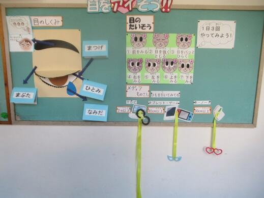 北校舎保健室横の健康コーナーです。10月10日は目の愛護デーということで、目に関する掲示がされていました。