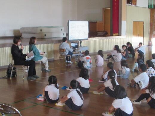 火曜日のお昼に児童集会がありました。今回は、図書委員会とPTA家庭教育委員さんとのコラボで読み聞かせがありました。家庭教育委員のお二人が「戦争をやめた人たち-1914年のクリスマス休戦」を読み聞かせしてくださいました。BGMありの本格的な読み聞かせに、子ども達だけでなく先生方も引き込まれてしまいました。感想のぶつぶつタイムでは、1年生もしっかり感想を言い合い、発表までしてくれました。とても素敵な時間をありがとうございました。