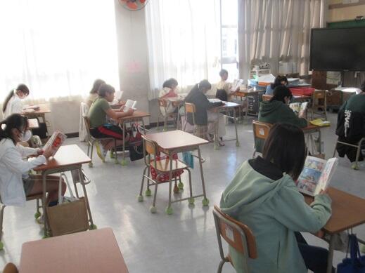 朝よむよむタイムを水曜日に実施していますが、8時20分~30分までの間に健康観察も含めての10分しかなく、前期の反省の中でもう少し読書の時間を確保できないかということになりました。そこで、5分だけですが延長し、その分1校時の休み時間を5分にすることで、2時間目以降の日課は変更なく読書の時間を確保してみようということになりました。今日がその初日でしたので学級をまわってみると、みんな静かに本の世界に浸っていました。朝からシーンとして本を読むのはいいことですね。しばらく水曜日はこの日課で行きたいと思います。