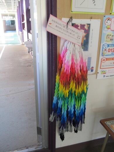 6年生の修学旅行が目前に迫ってきました。まだインフルエンザで出席停止の子どももいますが、金曜日には全員復帰できることを願っています。昨日のお昼の放送で、6年生が鶴を折るのに協力してくれた下級生にお礼を言っていました。そして、みんなの平和への思いが詰まった千羽鶴を知覧特攻平和会館におさめてきますと言ってくれました。出発までは児童玄関に飾っておきますとのことでしたので、早速写真にとってきました。きれいな鶴は桜っ子の平和への思いが詰まった大切なものです!