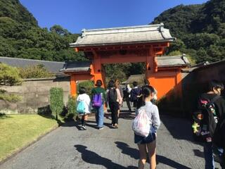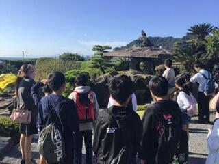 2日目がスタートしました。朝の準備がスムーズだったので、添乗員の岸田さんのはからいで、ホテル周辺を散歩しました。ホテルのみなさんにご挨拶をしてホテルを後にしました。本日最初の見学地は仙巌園でした。桜島をバックに島津家ゆかりの史跡見学の場所でしたが、子どもたちはお買い物で頭の中はいっぱいだったようです。おみやげ買って今から水族館へ向かいます。