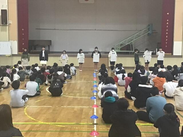 昨日の児童集会は、新委員長さんのあいさつでした。新しく委員長になった5年生が、それぞれの委員会の活動目標を発表してくれました。すでに、やる気満々の5年生です。期待しています!