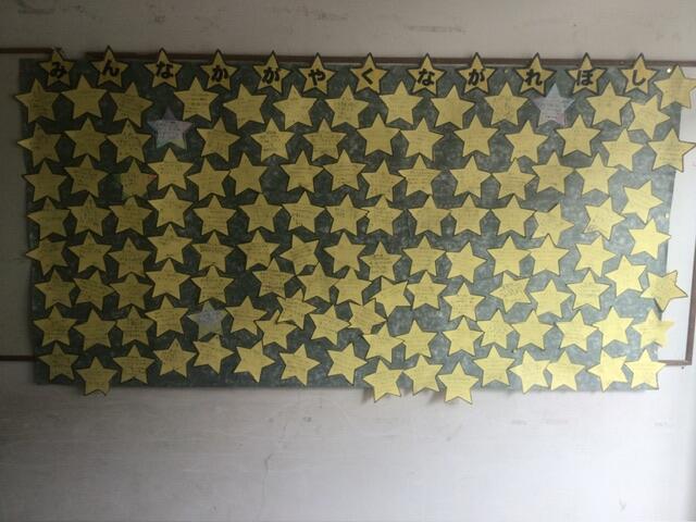人権委員会のみんなが「みんなかがやくながれぼし」の取り組んでくれました。星のひとつひとつに、友だちの良いところや友だちにしてもらって嬉しかったことが書いてあります。お互いのよさを認め合う取り組みありがとうございます!素敵な掲示です。