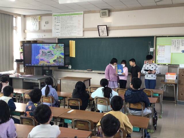 今週、3年生が国語の学習の一環で1年生に読み聞かせをしました。グループで本を選び、役割分担して練習を進めてきました。そして、1年生の教室に行って読み聞かせをしました。1年生も知っている本だったようで、しっかり聞いてくれました。ちょっぴり緊張もあったと思いますが、上手に読み聞かせをしてくれていました。