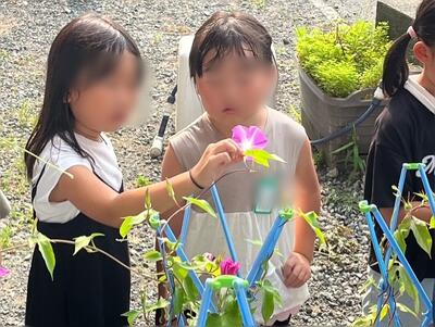 朝から、1年生の子供たちが自分たちの朝顔のところに集結していました。きれいに咲いている花をそれぞれ一輪ずつ取っているようです。