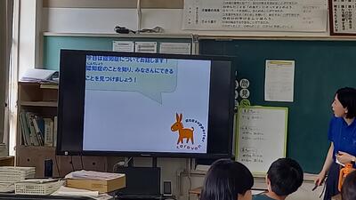 2・3校時に、荒尾市役所介護福祉課の方を講師としてお招きし、6年生を対象に認知症サポーター養成講座をしていただきました。日本の高齢社会と認知症の現状、環境や周囲の人の接し方で症状が変わること、認知症の方をサポートするためにできること等について、お話ししていただきました。
