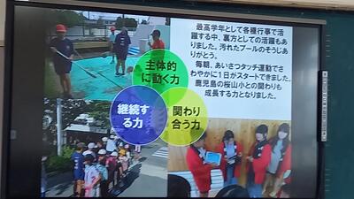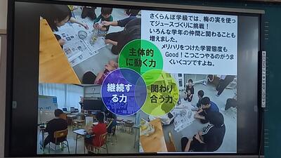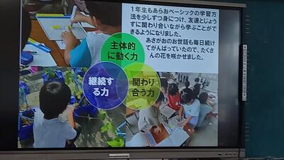 まず初めに、校長先生から、4か月の間、「主体的に動く力」「継続する力」「関わり合う力」の3つの力が、各学年でしっかり付いてきたことを振り返っていただきました。