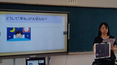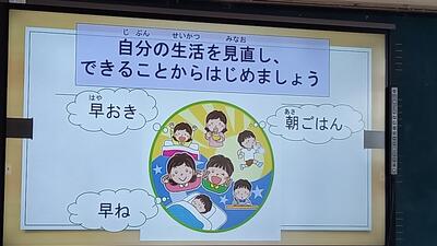 次に、養護の光澤先生から、早寝・早起き・朝ごはん、各種治療(特に歯の治療)をしっかりするようにお話がありました。