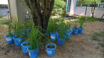 5年生がバケツ稲を育てていましたが、暑さのため、木陰で管理しています。順調に育っています。