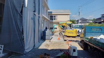 トイレ改修工事も順調に進んでいます。9月頃には、南校舎のトイレが全てバリアフリー化する予定です。また、児童玄関前にはスロープが造られ、どなたでも校舎への出入りが容易になる予定です。