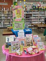 ご覧のように、桜色のテーブルクロスや小物に囲まれた「春」に関連する本がずらりと並べてありました。思わず手に取ってみたくなりますよね。