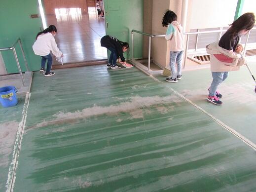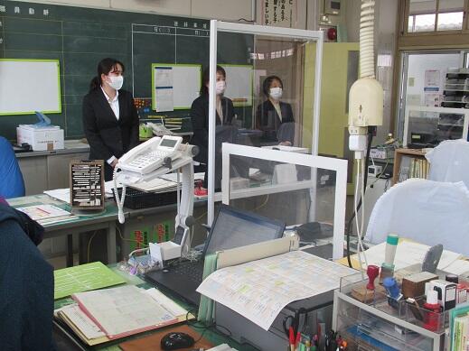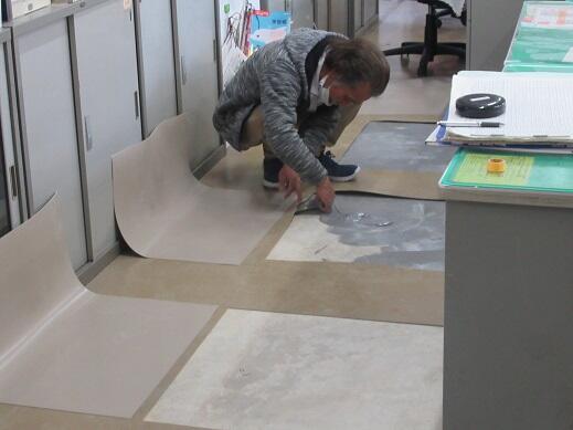 職員室の床が至る所で剥げていましたので、補修していただきました。今まで椅子が引っかかって動かなくなることもありましたが、スムーズに動くようになりました。教育委員会にはたくさんの補修等をしていただき感謝です。