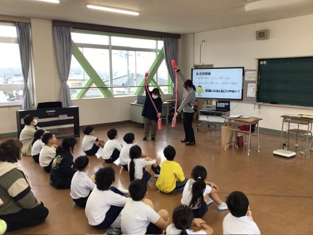 今週、各学年で身体測定が行われました。すくすく成長している桜っ子ですが、合わせて保健指導も行われました。今回は、少々難しいですが「生活習慣病」についての指導でした。最初に川﨑先生から生活習慣病についてお話があり、好きなもの特にスナック菓子ばかり食べていると血液がドロドロになるということで、サラサラ血液とドロドロ血液の違いを視覚的に見せられました。続いて栄養教諭の畑田先生からおやつについてのお話しがあり、ポテトチップス1枚食べてそれを消費するには「ジャンボリミッキー」を54秒踊らないといけないということに子どもたちもびっくりでした。そして、みんなで時間通りに踊ってみました。とても楽しく健康について勉強できたのは、養護教諭と栄養教諭でタッグを組んで指導していただいたからです。こういうありがたい環境にある桜山小ですね。