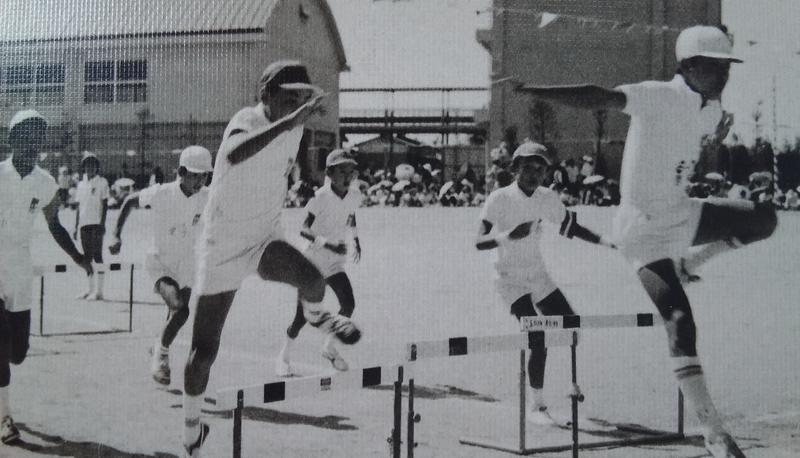 運動会の様子です。北側校舎と体育館が後方に見えます。
