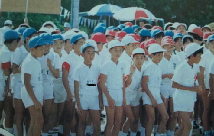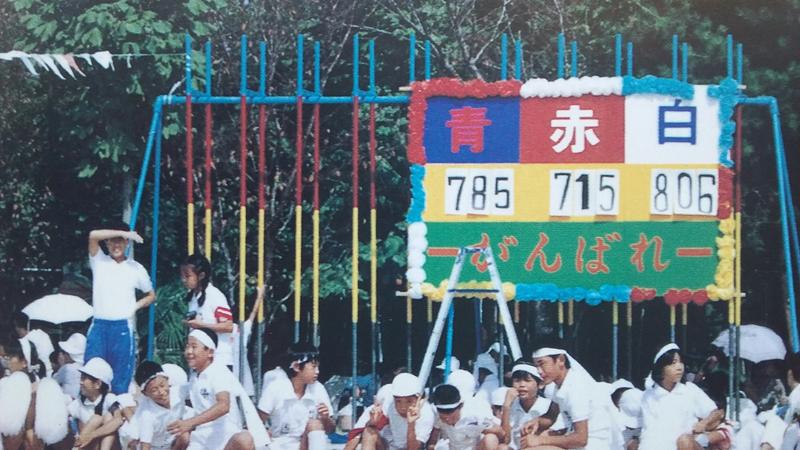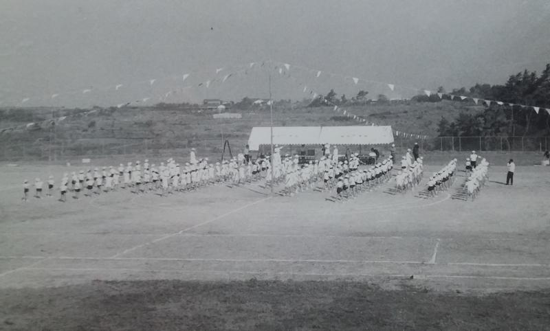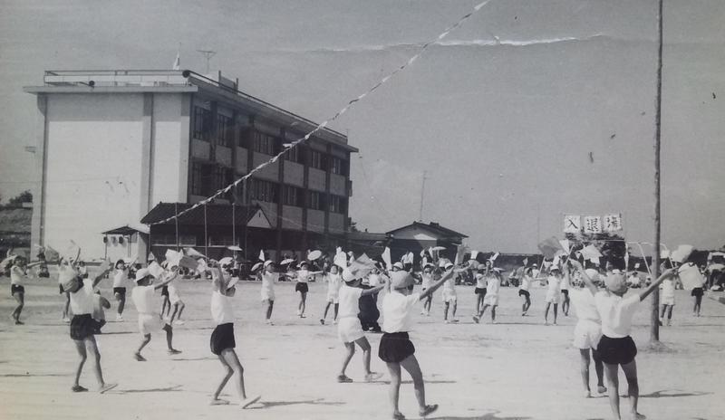 運動会の様子2 大きなクスノキはまだありません。 奥は現在の山浦地区。