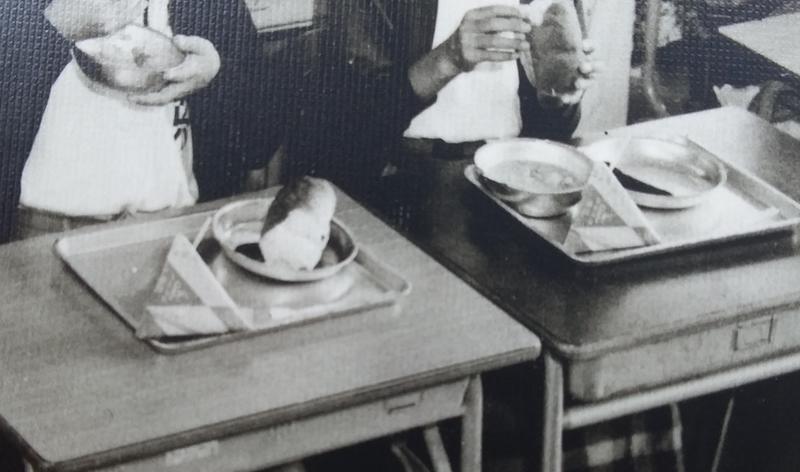 給食のメニュー。金属製の器、牛乳のテトラパックが懐かしい。