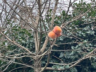 北門の近くに1本の柿の木があります。どうやら甘柿の木のようで…。今年は、たくさんの花が咲いたのですが、実際に身を付けたのは3個だけでした。葉が緑色から茶色に変化する頃には、徐々に実も色づき始め、全て落葉した後に残っていました。