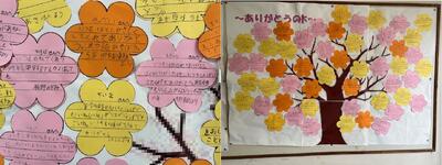 北校舎1階の掲示板に「ありがとうの木」が掲示されています。学年に関係なく、友達の思いやりあふれる行動等への感謝の気持ちがたくさん貼り出されていました。色とりどりの“ありがとう”の葉っぱであふれている光景は、見ているこちらも心がポカポカしてきます。