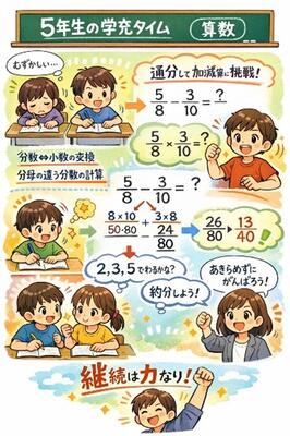 5年生の学充タイム(算数)に参加。分数↔小数の変換、分母の違う分数の加減算を中心に練習をしました。