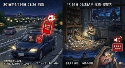 熊本地震から10年が経ちました。10年前の夜9時26分にその大きな揺れは起こりました。その時、私は仕事帰りの車の中でした。揺れを感じる直前に、今まで聞いたことのないようなアラート音。そして、運転ができないほどの揺れ。自宅に戻ると、キッチン棚から落ちた大量の食器の破片に驚きました。しかし、本当に恐ろしかったのは、約30時間後の本震でした。アラート音と余震に震え上がった記憶が今でも鮮明に残っています。