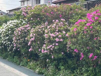 桜の花がすっかり散り、今では葉桜となりました。今は、南校舎の南側フェンスに白色・濃いピンク色・薄ピンク色などの花が満開間近です。